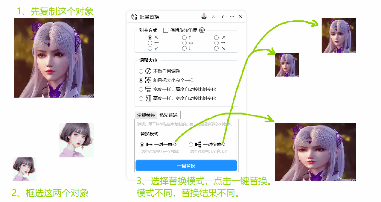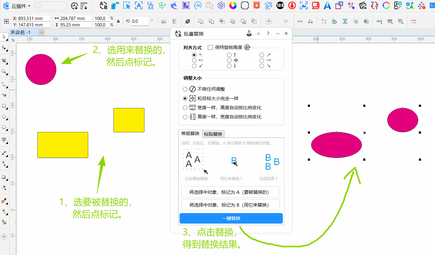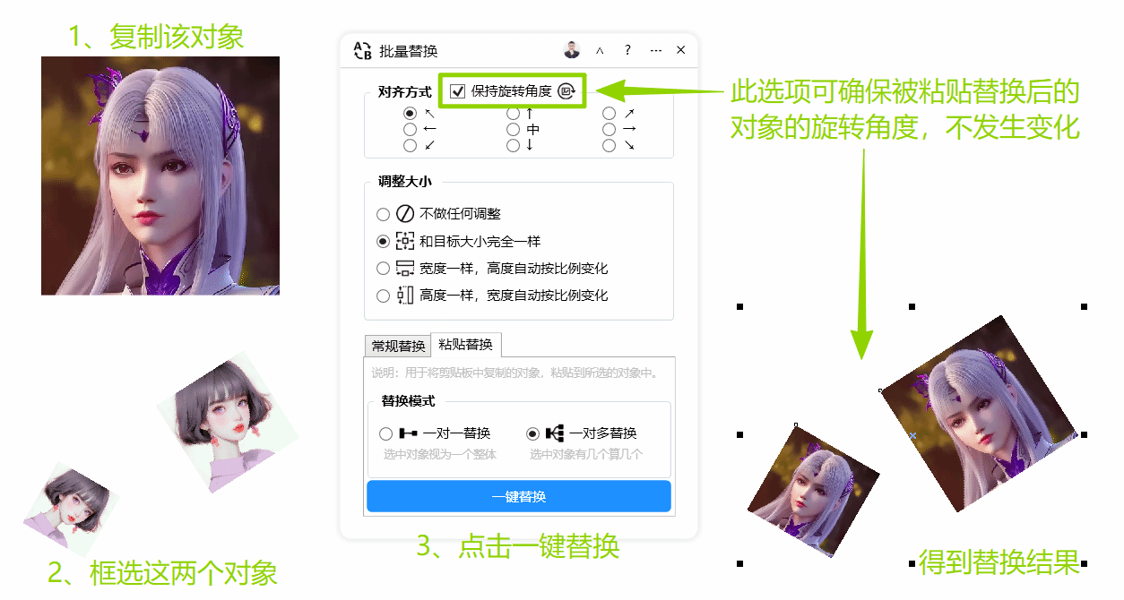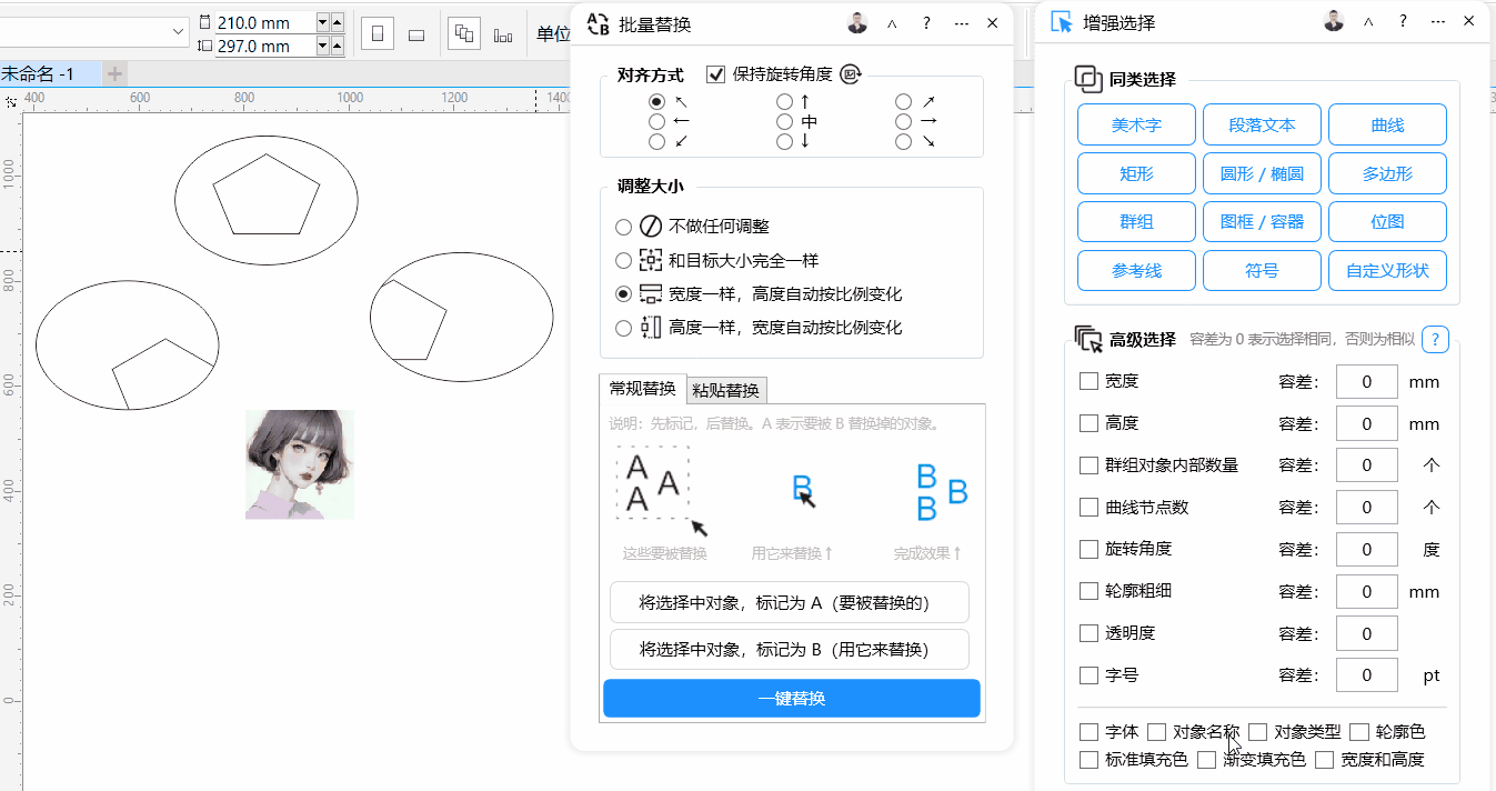 快速替换对象,支持常规替换和粘贴替换,支持灵活的尺寸调整和对齐方式、保持旋转角度等功能,排版必备通用功能之一。
