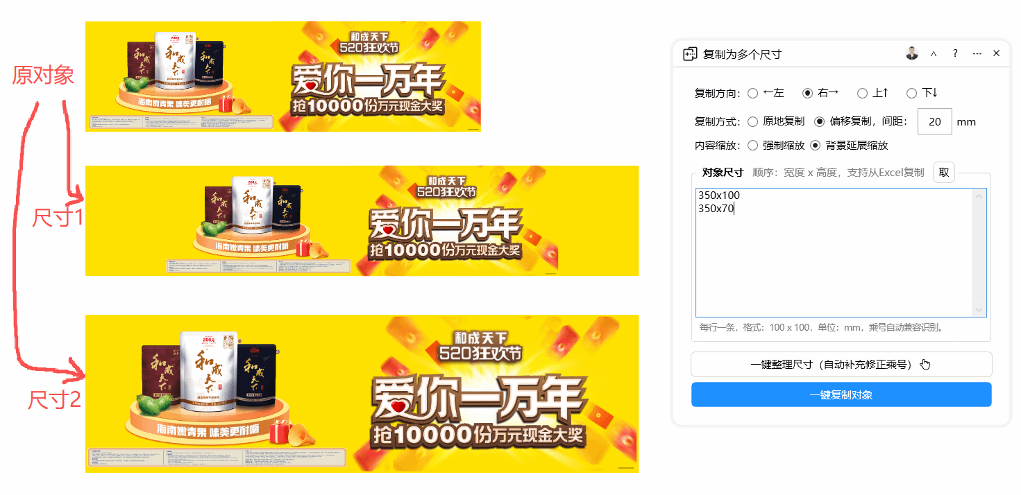 该插件可一键将选定的对象,批量复制快速创建多个尺寸的副本,并调整为指定的尺寸大小,可强制缩放,也可以自动识别背景,内容按比例自动缩放。