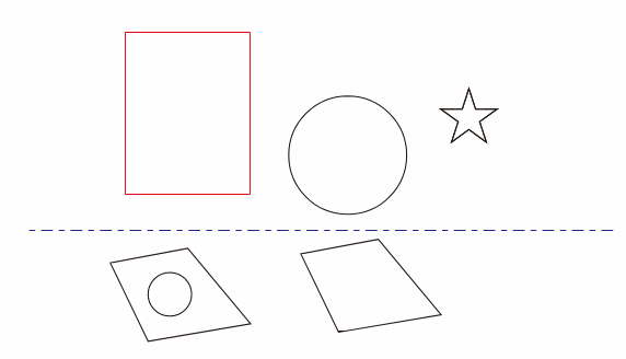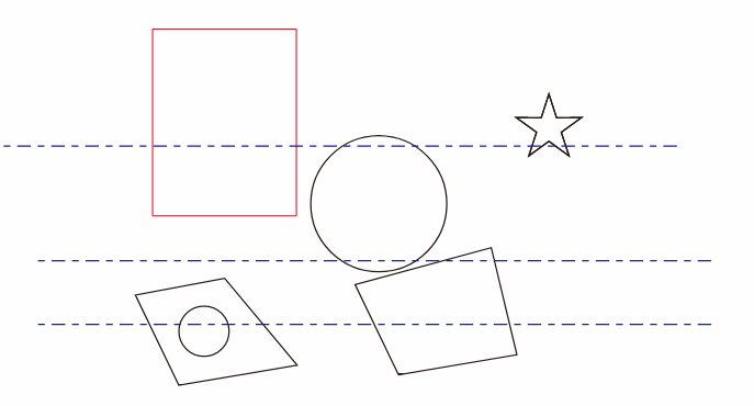 横向:上图左图5个图形,横向分组以蓝色线条为分界,会组成两个群组。注意行与行直接有明显的空白分界。上面一组,从水平方向看高度范围有重叠,所以会归为一组。