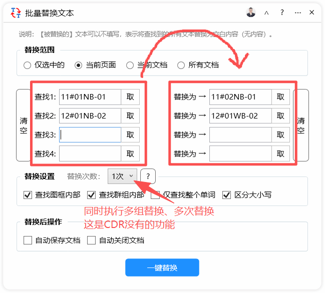 CDR本身不支持多组替换和多次替换,云插件的批量替换文本可实现此功能。