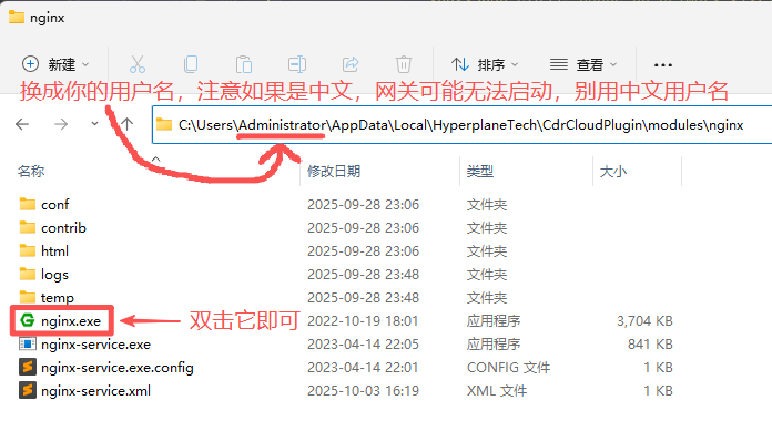 由于云插件多次升级,版本不同,网关路径可能不一样,请在电脑中找到以下任意文件夹中的 nginx.exe 文件双击启动即可。(Administrator表示的是你电脑的用户名)