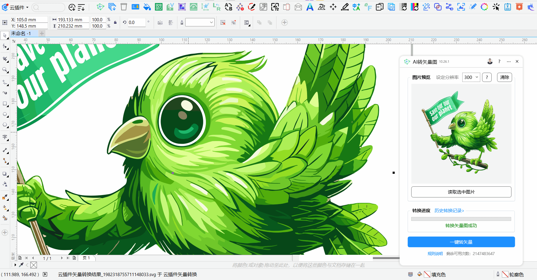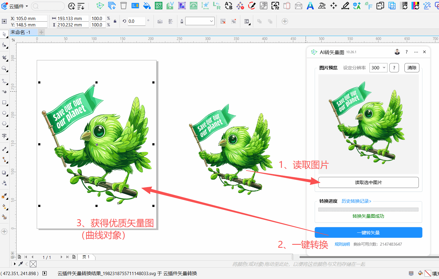 云插件中AI转矢量图,采用了极简的使用方式:只需选中CDR中的图片(或者任意CDR对象),然后点击读取图片,再点击一键转换即可完成。