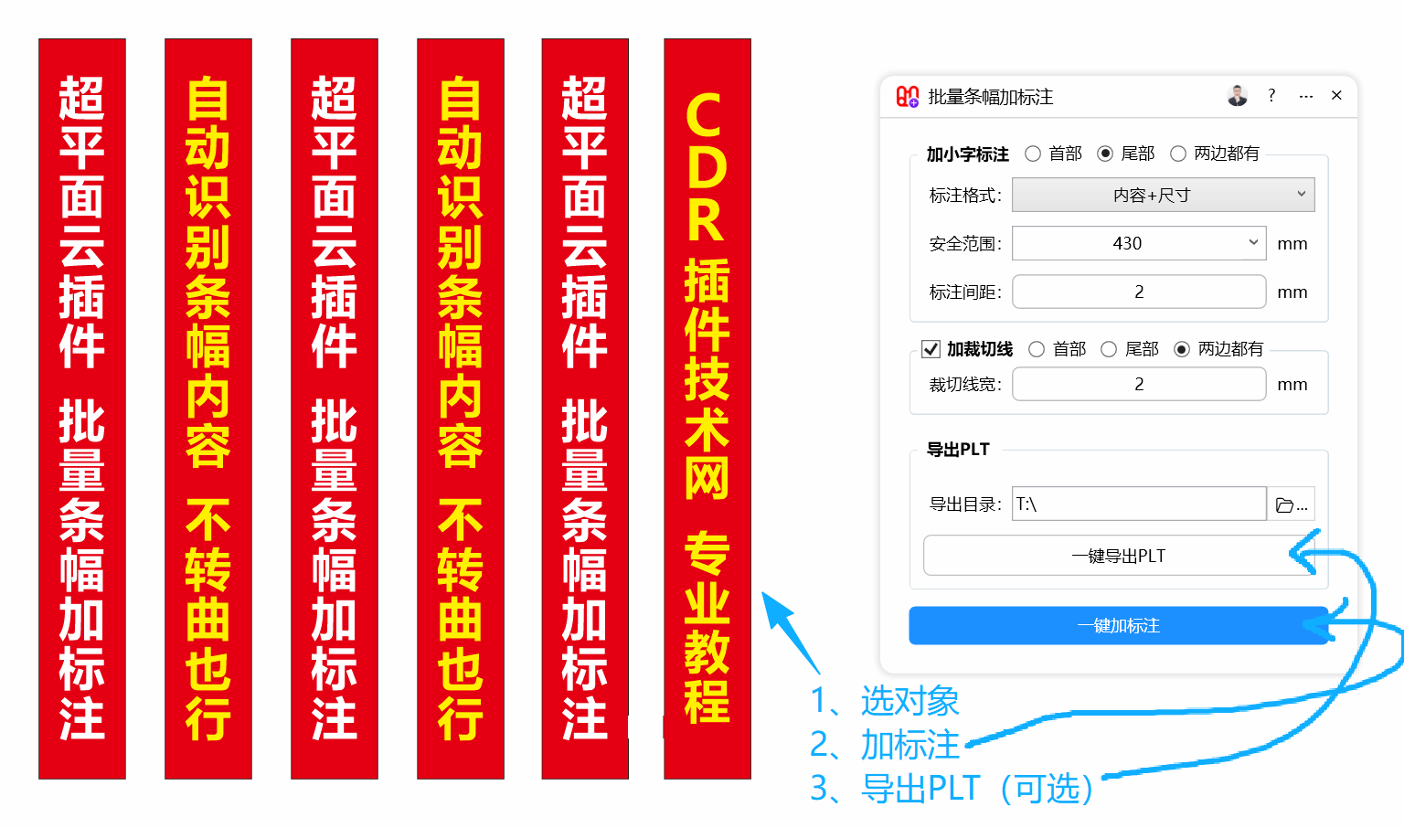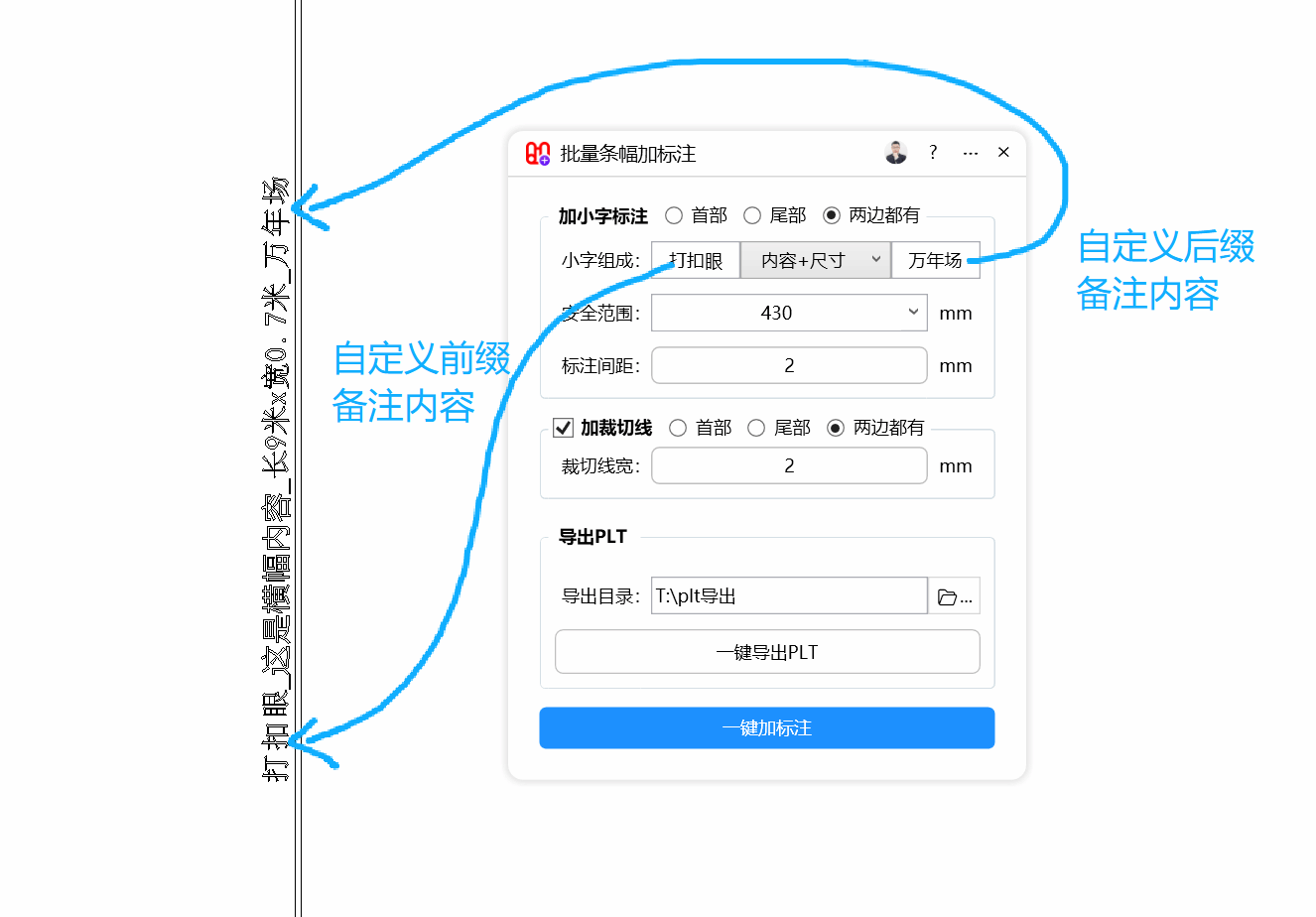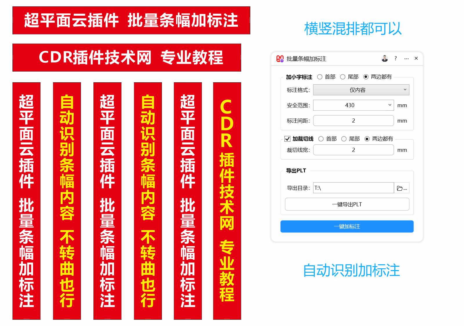 面向条幅加工厂商设计,助力客户快速识别产品,高效处理非标准条幅规格,支持自定义内容录入、长度设定及个性化PLT导出。功能支持在条幅单侧或双侧自动附加内容标识,便于成品交付时的客户辨认,并可按需生成裁切辅助线以优化制作流程。提供自定义备注栏、条幅长度控制、内容宽度限定及扎筒布料延长等灵活配置,让制作信息一目了然。支持批量个性化导出,大幅提升生产效率。
