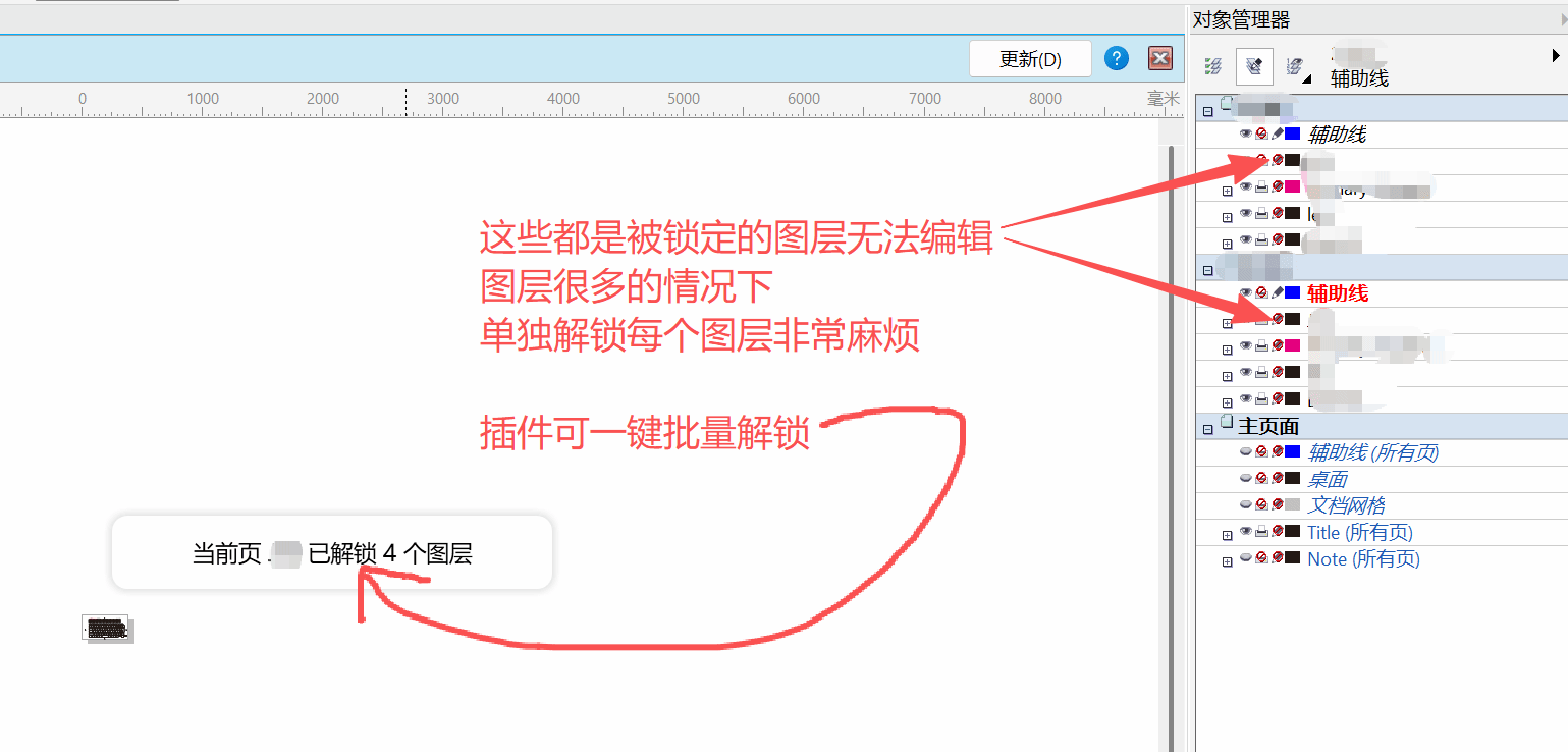 一键解锁当前页面的所有图层,适用于页面中被锁定图层非常多的情况,解决人工解锁操作非常繁琐耗时的问题。