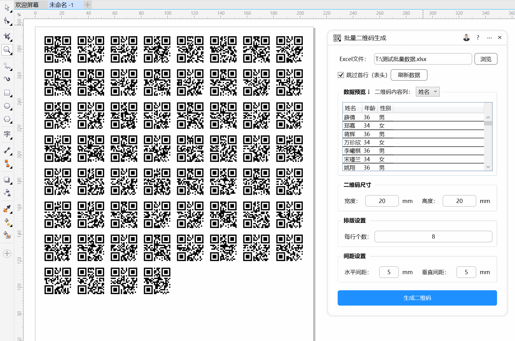 批量二维码可用来根据EXCEL数据批量生成创建矢量二维码,并在页面上自动排版。